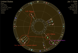 Overlay of the morning of Jan 7 (outer wheel) with the U.S. natal chart (inner wheel). Only selected planets are shown.