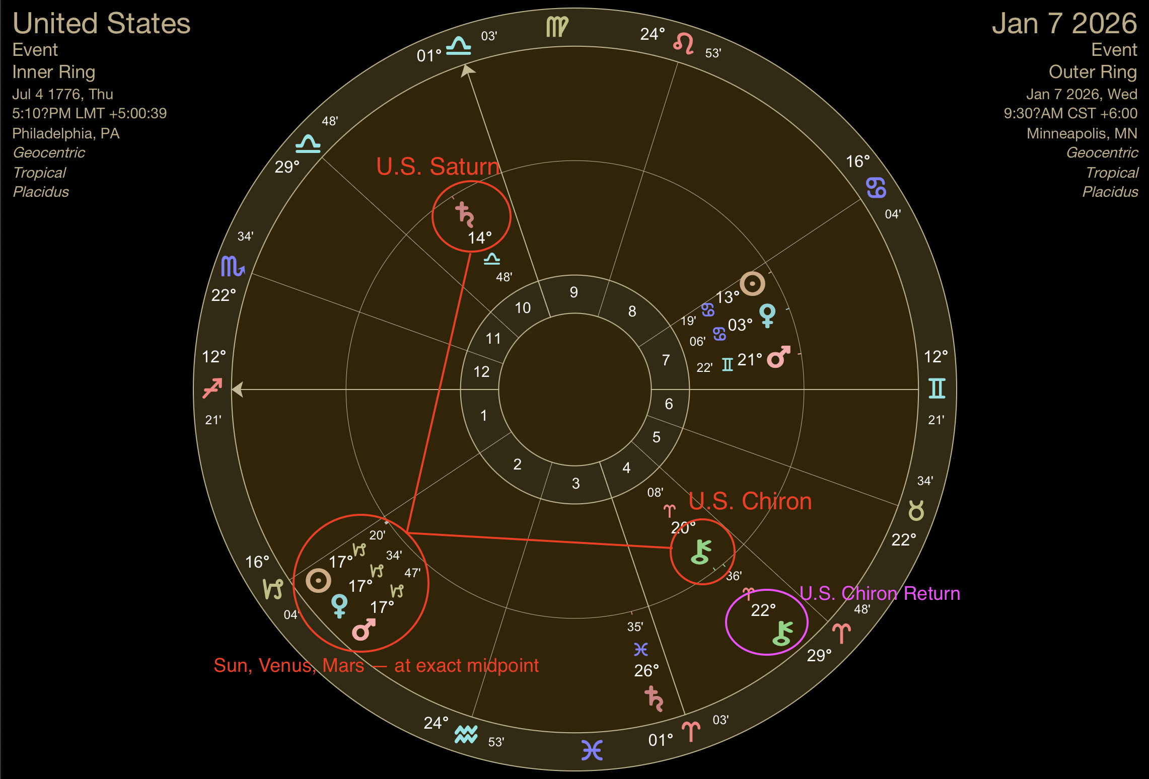 The Cancer-Capricorn axis doesn't get much darker than the state-sanctioned murder of a young mother. Renée Good was shot and killed by an ICE agent on January 7th, the same day that the Sun, Venus, and Mars all reached the same important zodiacal degree, 17º Capricorn, at an exact midpoint between the Saturn-Chiron opposition in the U.S. horoscope. Saturn (authority) and Chiron (wounding) together represent the struggles and triumphs against organized brutality that has shaped America's history. They also represent the healing potential of compassion codified into law, whether outlawing child labor, enforcing food safety, or upholding civil rights. Tragedies like the murder of Ms. Good shock us into remembering that we cannot have a compassionate society if we do not fight for it.